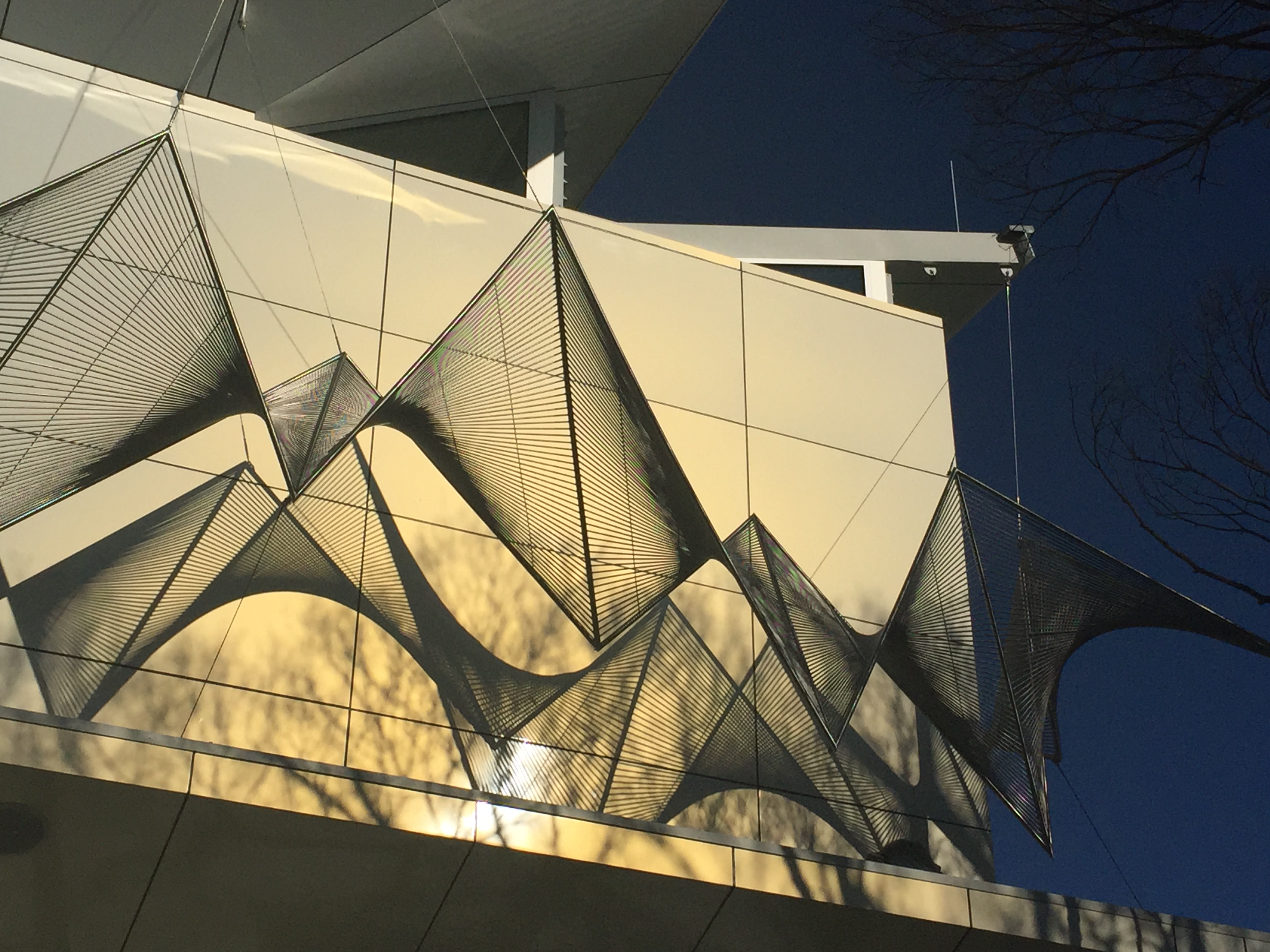“Crossing Paths” is a series of interwoven hyperbolic planes employing a lateral weave. The layering of the cable will create a ‘moire’ effect and produce a dynamic shadow play on the building’s north and east facade. Designed by NBRS Architects, the building was a perfect canvas for this kind of contemporary sculpture. Matt’s work is articulated at night with programmable LED lighting, contributing to the activation of QE II Square at the heart of Albury City.