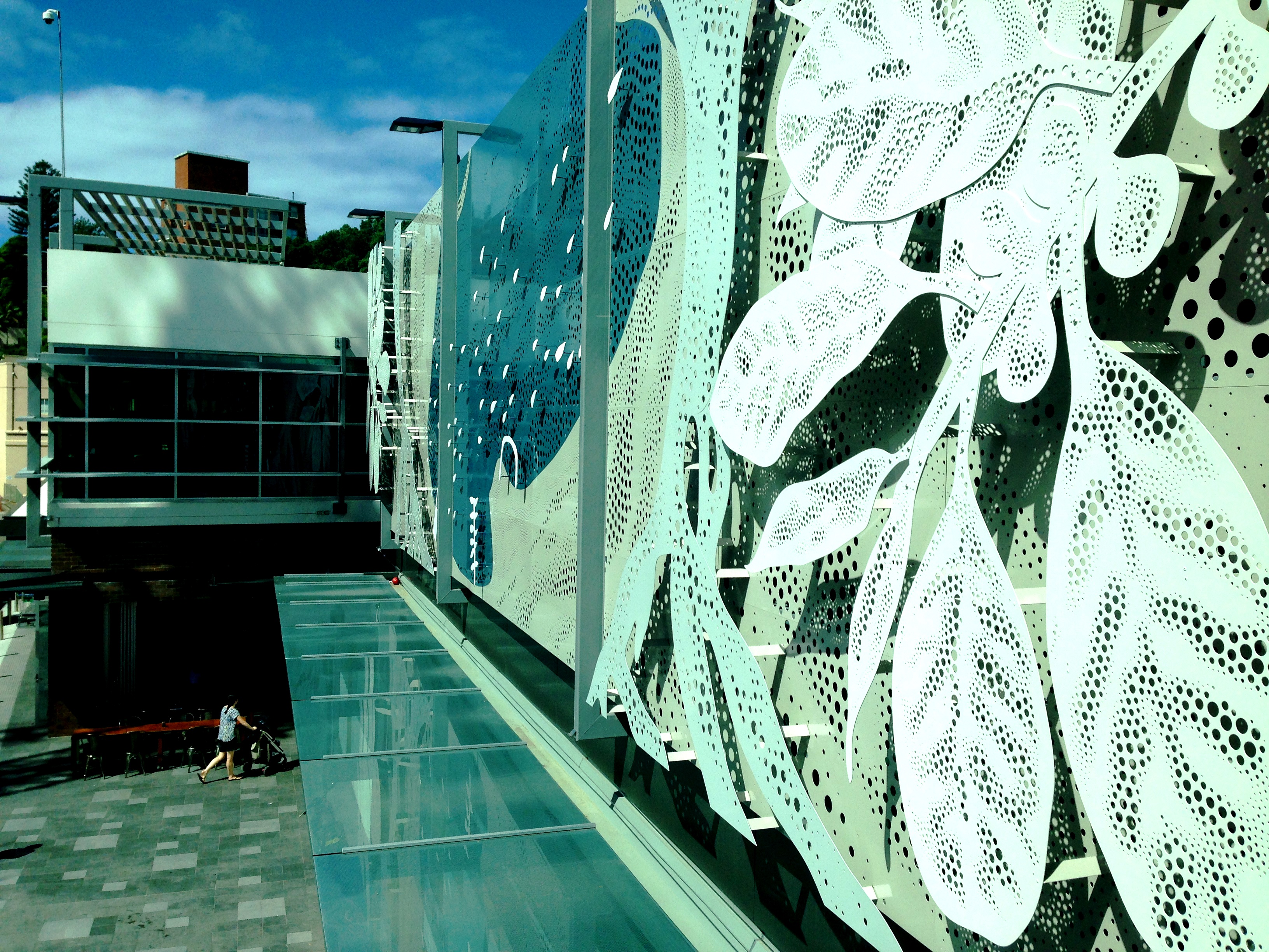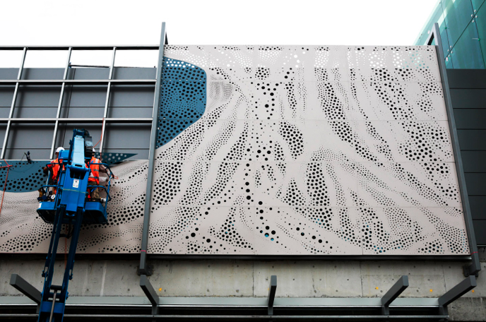 Jade’s design depicts an abstracted interpretation of Double Bay’s iconic geography. PublicArt Works worked closely with Alex Polo from Metal Stone Wood to extend the typical perforated metal patterning, making it into something a lot more interesting. Layered features gave the facade more depth, and the artist’s hand is visible in the tiniest detail. Jade worked closely with Alex’s algorithmic generated perforations, using diverse hole sizes up to 60mm in diameter. Additionally, laser cut sections are powder coated to Jade’s subtle colour palette, and assembled like a giant jigsaw puzzle.